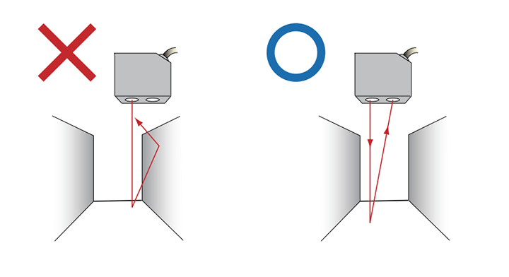 感應(yīng)頭周?chē)嬖诒诿鏁r(shí),投射激光經(jīng)過(guò)壁面反射回的亂光會(huì)導(dǎo)致測(cè)量的偏差。若安裝環(huán)境限制使得傳感器必須緊挨著壁面安裝時(shí),請(qǐng)將傳感器的投光光軸和受光光軸構(gòu)成的平面平行于壁面。且將壁面處理為低反射率的黑色表面,以降低壁面的反射光量。