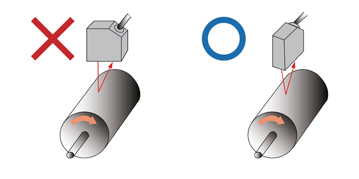 測(cè)量旋轉(zhuǎn)物體時(shí),請(qǐng)將傳感器的投光光軸和受光光軸構(gòu)成的平面平行于旋轉(zhuǎn)物體的旋轉(zhuǎn)軸,這樣可以最大程度的抑制旋轉(zhuǎn)物體上下晃動(dòng)或位置偏移所帶來(lái)的影響。