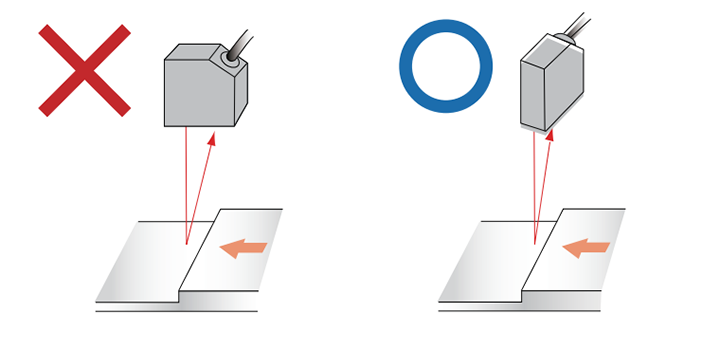 被測(cè)物的表面存在段差的情況時(shí),請(qǐng)將傳感器的投光光軸和受光光軸構(gòu)成的平面平行于段差的邊緣區(qū)域?qū)y(cè)量的影響。