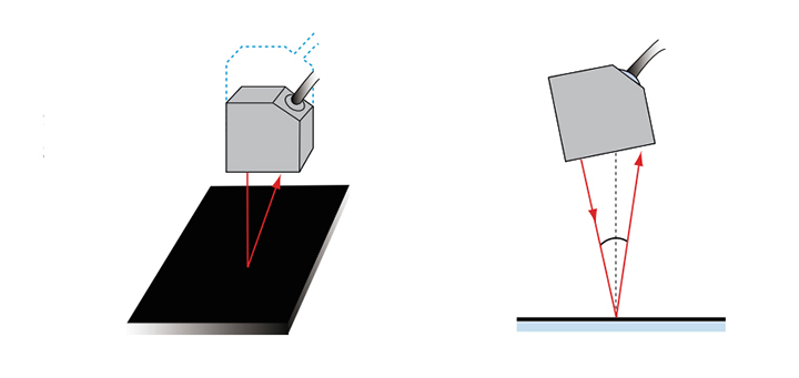 被測(cè)物為黑色物體時(shí),反射光量較少,使得受光素子的受光量較少,導(dǎo)致分辨率下降??梢酝ㄟ^(guò)縮短檢測(cè)距離,讓有效測(cè)量范圍內(nèi)盡可能的縮短傳感器的檢測(cè)距離,確保受光素子接收到足夠的受光量。也可以【正反射】方式傾斜安裝,時(shí)激光的入射角等于反射角,這樣提高受光素子接收的受光量。