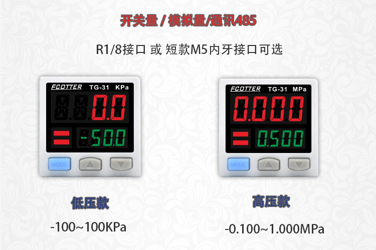 ECOTTER數(shù)顯壓力表有高壓款-0.1~1mpa 和 低壓款 -100~100kpa兩種量程不同的規(guī)格,低壓款常用于負(fù)壓檢測。這個(gè)系列產(chǎn)品有開關(guān)量、模擬量及通訊485款可選。