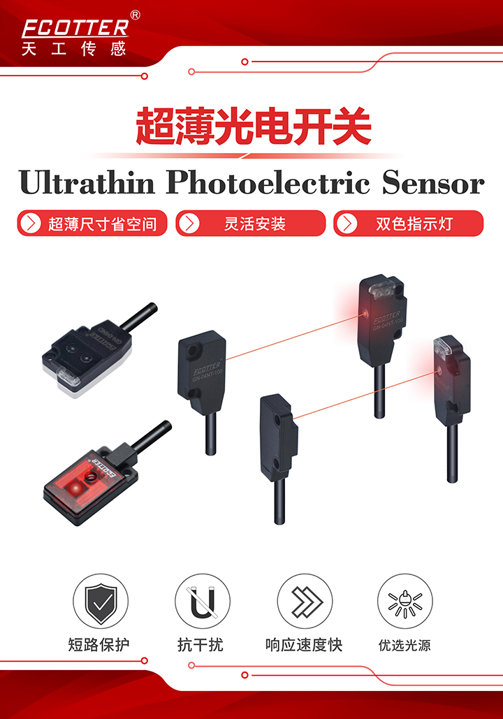 超薄型光電開關(guān)配備方便觀察的雙色指示燈設(shè)計(jì),上電亮紅色指示燈,輸出亮綠色指示燈。