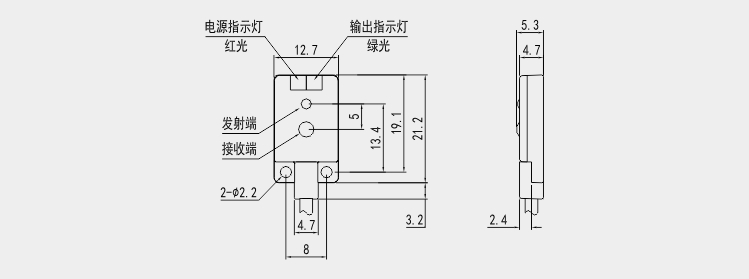 GN-045機(jī)身是21.2*12.7毫米的大小,有兩個指示燈,分別是電源指示燈紅色,上電就亮,還有一個輸出指示燈綠色。產(chǎn)品有兩個光孔,一個發(fā)射,一個接收,另有直徑2.2毫米的螺絲安裝孔,以固定位置。