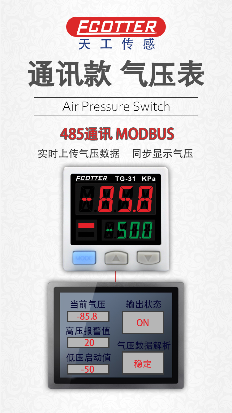 ECOTTER通訊型數(shù)顯壓力表具有RS485+一路開關(guān)量輸出的功能,主屏、副屏三色數(shù)顯,開關(guān)量有多種測量模式,簡單、窗口比較、應(yīng)差模式等,可按鍵快速設(shè)置閥值,同樣也可以通過RS485通訊進行設(shè)置。