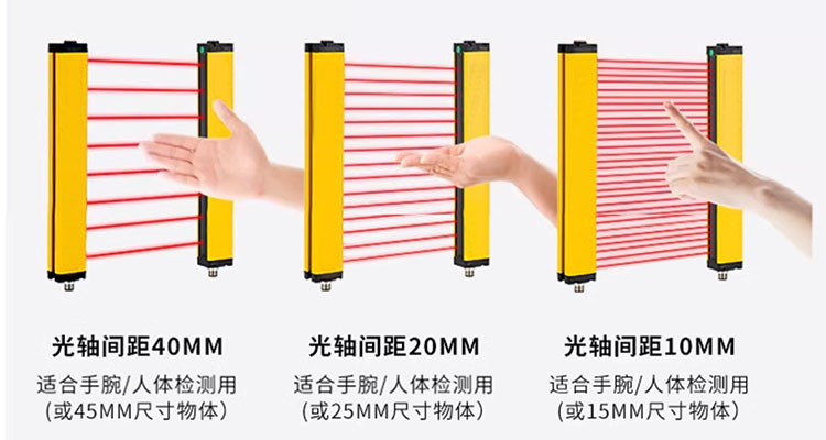 安全光幕通過不同光軸間距的選擇來決定保護的部位,光軸間距越來密集,保護的就越細(xì)致,根據(jù)光幕安裝的位置、離危險設(shè)備的距離選擇適合的款式。