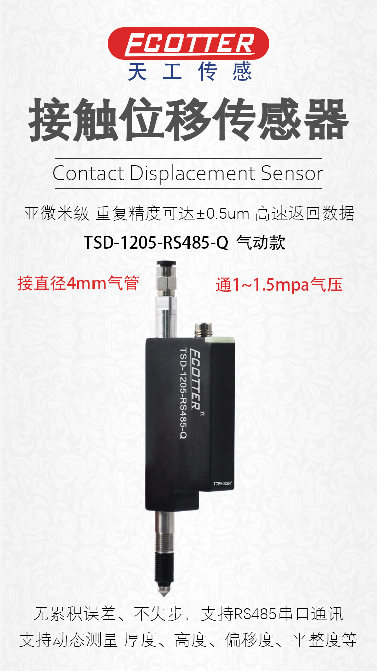 ECOTTER 氣動(dòng)款 接觸位移傳感器 TSD-1205-RS485-Q 由 深圳天工 自主研發(fā),通過光學(xué)絕對(duì)值直線編碼器原理,使傳感器具備高分辨率,不產(chǎn)生累積誤差,不產(chǎn)生失步。支持串口通訊,多種量程規(guī)格可選。可測(cè)量厚度、距離、直徑、偏移度、平整度等。