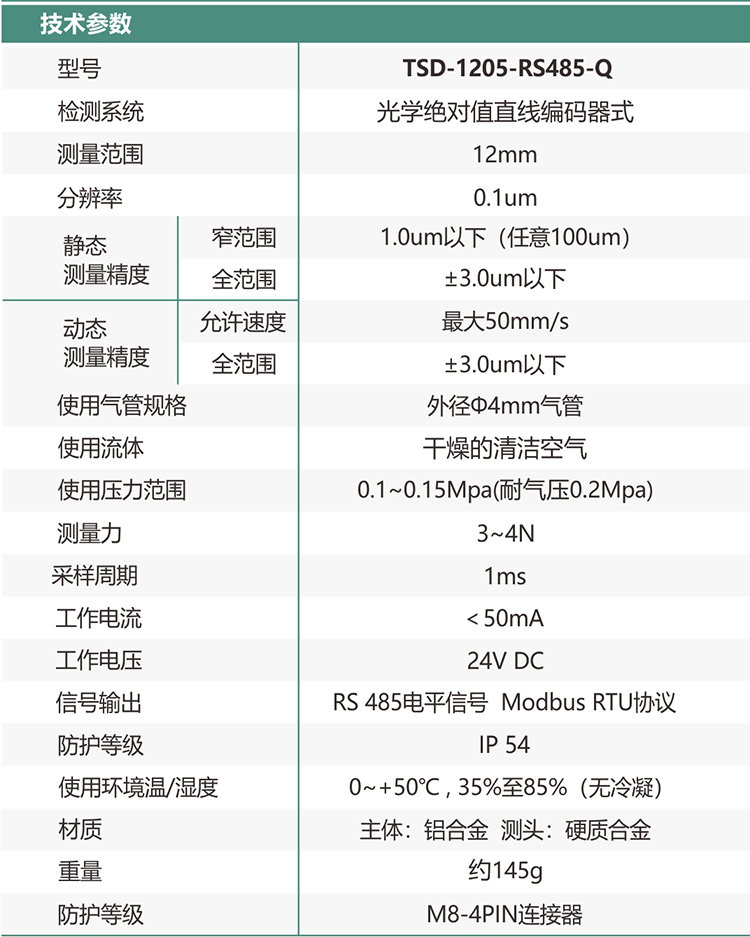 TSD-1205-RS485-Q 氣動(dòng)款,連接直徑4毫米氣管,使用氣壓范圍1~1.5mpa,通氣時(shí)探桿將被推出,伸出進(jìn)行測(cè)量,這款接觸位移傳感器量程12.5mm,重復(fù)精度0.5um,測(cè)量精度可達(dá)3um,滿足工業(yè)大部分測(cè)量需求。