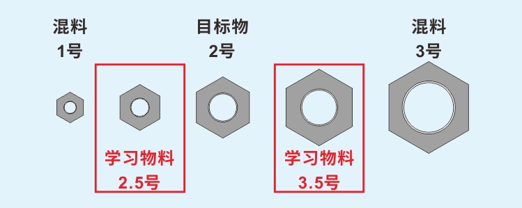 目標(biāo)物通過傳感器檢測區(qū)域時(shí)會以各種姿勢進(jìn)行,所以我們?yōu)榱吮苊饴z,經(jīng)常會選擇比原目標(biāo)物稍大和稍小的物料進(jìn)行學(xué)習(xí)。