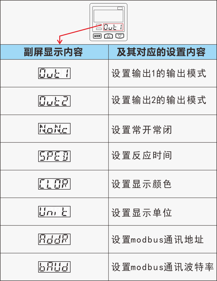 ECOTTER TG-31系列壓力表 可以設(shè)置輸出1、2的輸出模式、常開常閉、反應(yīng)時(shí)間、顯示顏色、顯示單位、通訊地址、波特率等,進(jìn)入菜單后副屏顯示設(shè)置的項(xiàng)目,主屏顯示項(xiàng)目下可設(shè)置的內(nèi)容。