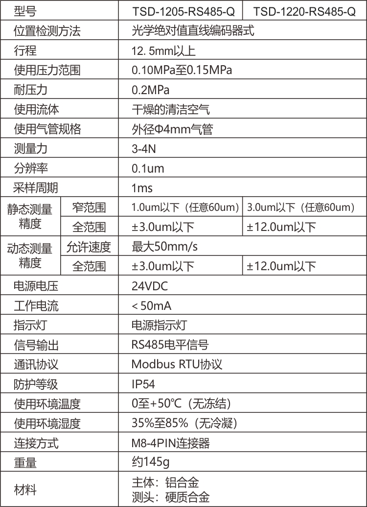 TSD-1205-RS485-Q為氣動(dòng)型,由氣管接口可接直徑4mm氣管,通0.12~0.17mpa氣壓推出探桿,測量精度可達(dá)3um。支持RS485 modbus rtu ,可高速返回?cái)?shù)據(jù)每秒1000次,實(shí)現(xiàn)動(dòng)態(tài)測量。