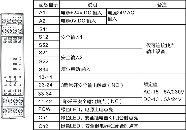 SRS-226-2N/P-3NO1NC是一款適用于具有開關(guān)量的安全產(chǎn)品輸入,具有3路常開(NO)安全輸出觸點(diǎn)和1路常閉(NC)輔助輸出觸點(diǎn)的安全繼電器。它可選擇單/雙通道操作,手動/自動復(fù)位。