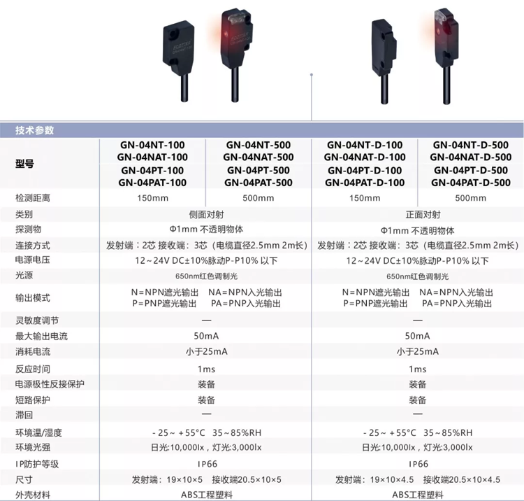 ECOTTER 超薄光電對射型 GN-04T系列產(chǎn)品為目前面市場自動化應(yīng)用中最小規(guī)格的光電型傳感器,它的最重要的特點是:小巧、薄的體型結(jié)構(gòu),只需擁有些許空間,即可安裝。并且檢測距離更長,最大可達500mm。具有正面對射和側(cè)面對射兩種款式可供選擇。