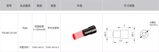 平行光聚光鏡TGLMC-03-04,檢測距離0-20mm,光斑直徑約Φ4mm??梢杂迷谛〕叽缑娣e的檢測。