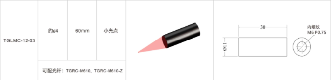檢測距離最遠的聚光鏡TGLMC-12-03,檢測距離60mm,光斑直徑約Φ4mm。這款聚光鏡適用于M6的同軸光纖,適合對中遠距離的小尺寸物體進行檢測。